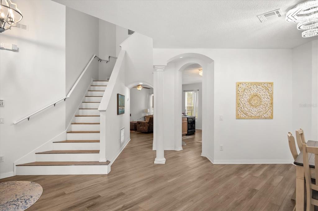 Inside, the open floor plan features NEW waterproof laminate flooring, modern fans and fixtures, NEW lighting, and abundant natural light throughout. The kitchen boasts upgraded light fixtures, an island, and excellent workspace—perfect for everyday living and entertaining. A spacious primary suite on the ground floor offers a spa-like ensuite bath and a generous walk-in closet for added convenience and privacy.