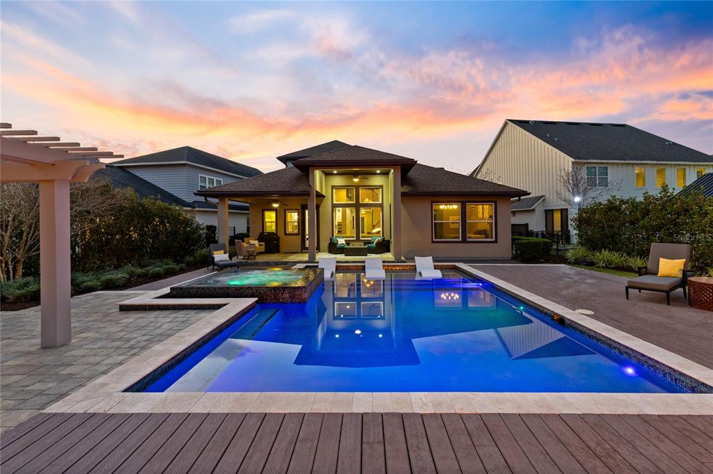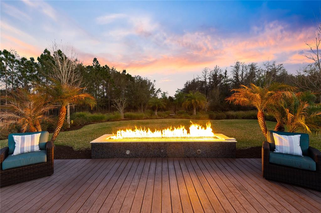 Outdoor living is equally impressive. Step outside to a true resort style backyard designed for entertaining and relaxation. The expansive outdoor space features a stunning custom pool with sun shelf loungers, a raised spa with spillover, and an oversized deck that creates multiple areas for gathering and lounging. A dramatic linear fire feature provides a beautiful focal point for evening gatherings, while the pergola covered lounge area offers additional shaded seating. Surrounded by lush landscaping and backing to tranquil conservation, the backyard offers exceptional privacy and breathtaking sunset views.