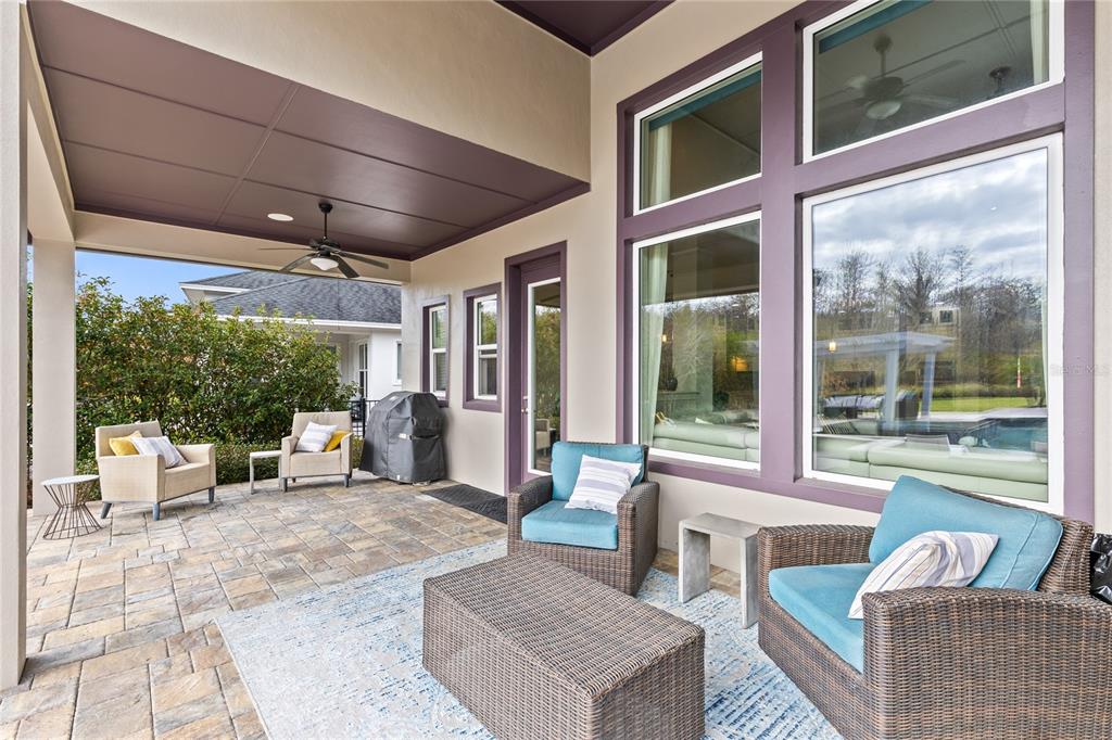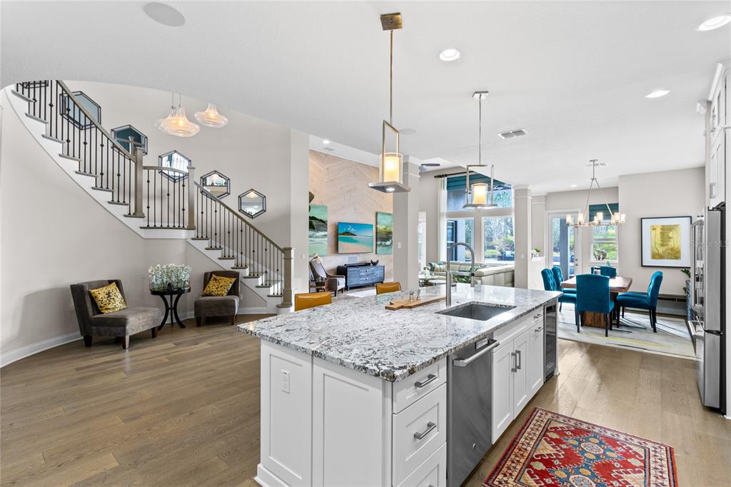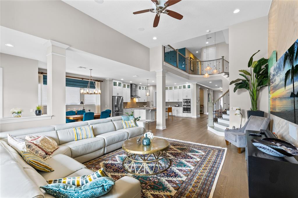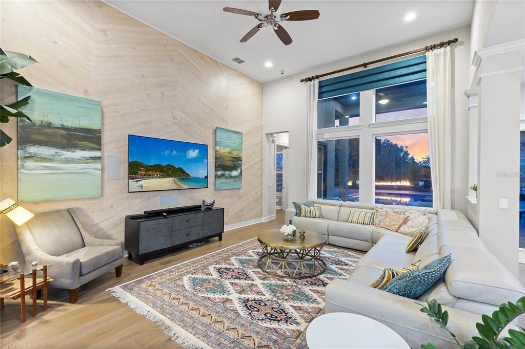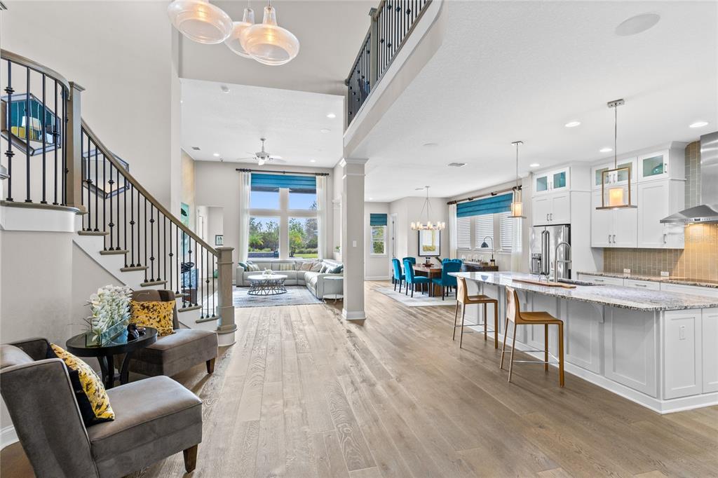 The spacious great room features soaring ceilings and a stunning wall of windows overlooking the backyard oasis and conservation beyond. This open concept living space connects seamlessly to the dining area and chef inspired kitchen, creating an ideal setting for both everyday living and entertaining. The kitchen offers granite countertops, a large center island with seating, stainless steel appliances, double ovens, a vented range hood, and a walk in pantry.