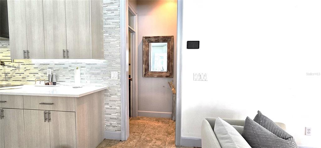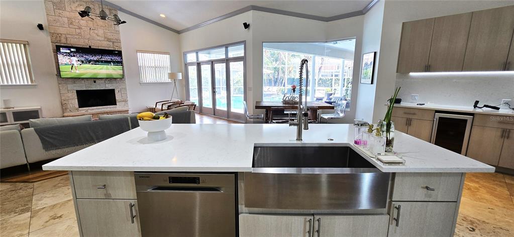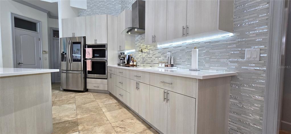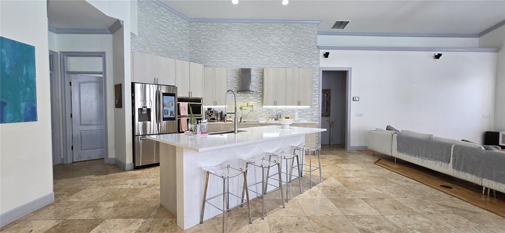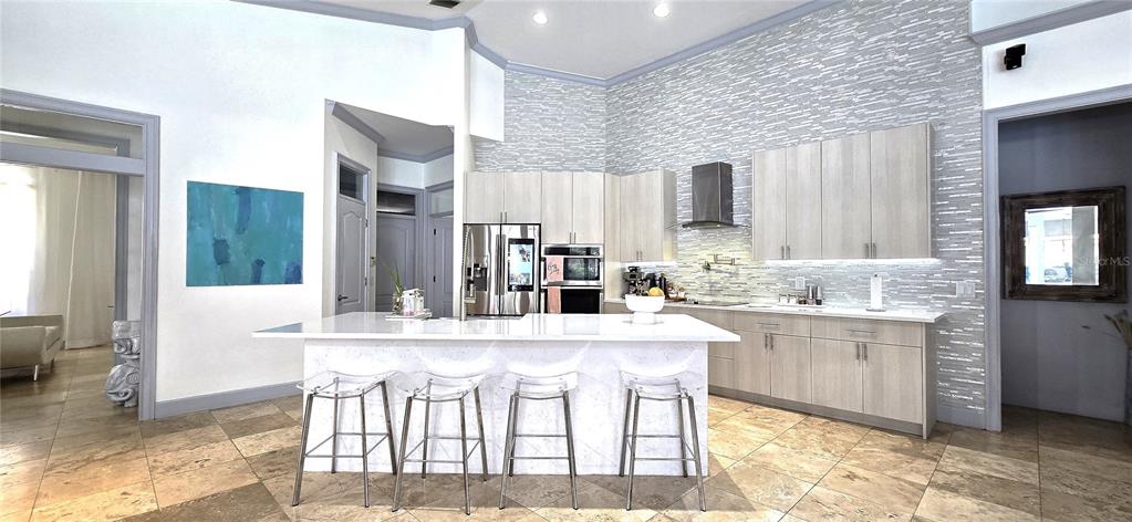 The fully updated kitchen is a chef’s dream, showcasing KraftMaid cabinetry, elegant granite countertops, gourmet stainless steel appliances, a spacious island, and energy-efficient LED lighting throughout.