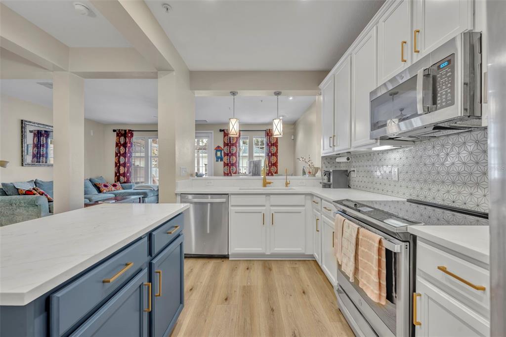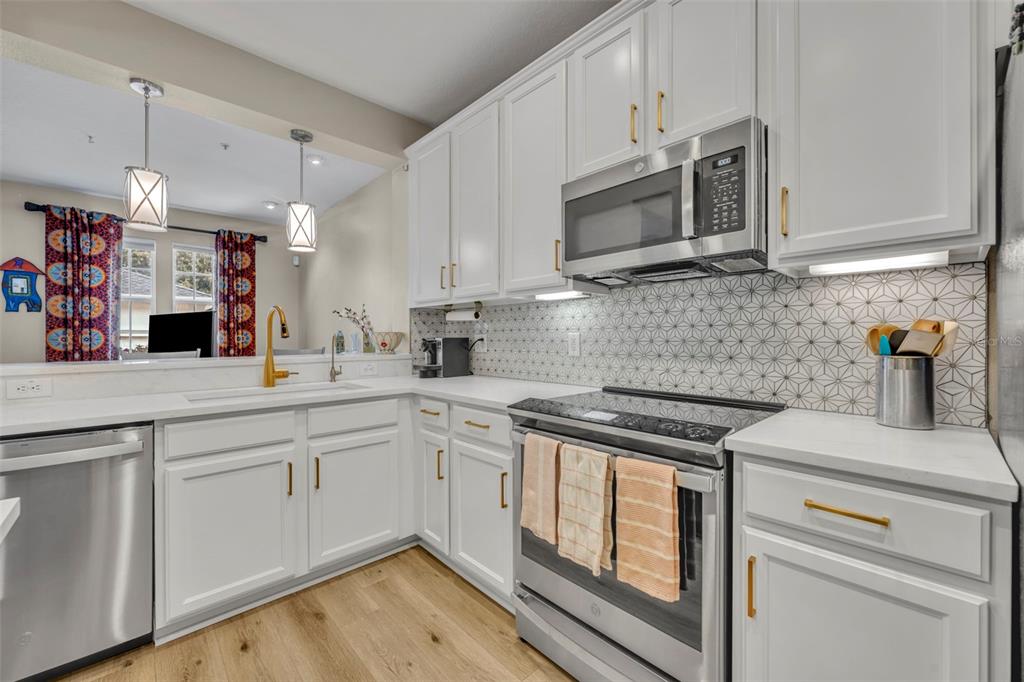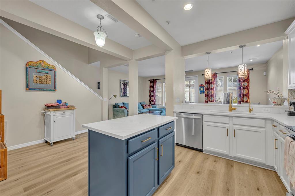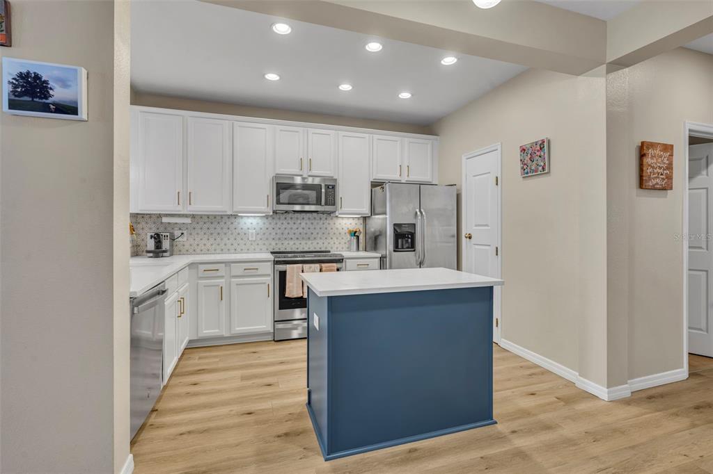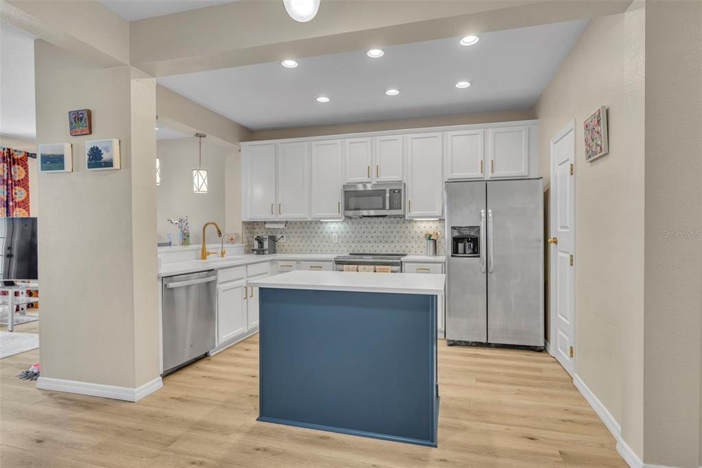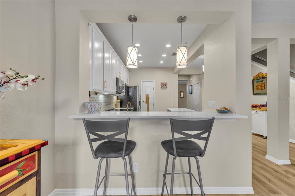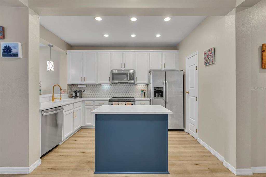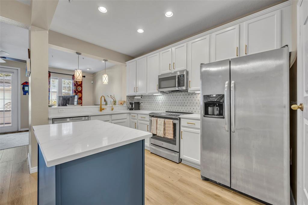 Step inside to high ceilings, luxury vinyl plank flooring, and a welcoming foyer/workspace with built-ins. The deep living room flows into the dining area and a bright, BRAND NEW updated kitchen featuring new quartz countertops, a new farmhouse-style deep sink, new kitchen hardware, solid wood cabinets, stainless steel appliances, an eat-in bar, and pantry. A reverse-osmosis drinking-water system and whole-home water softener (installed about a year ago) add extra convenience. A half bath and additional storage closet complete the first floor.