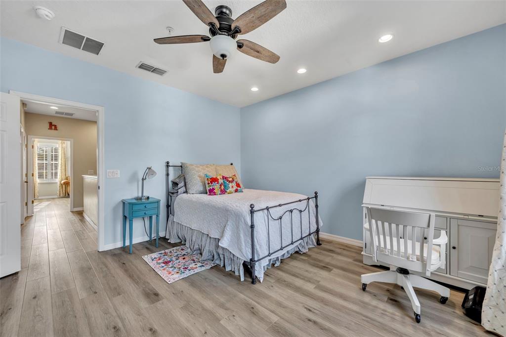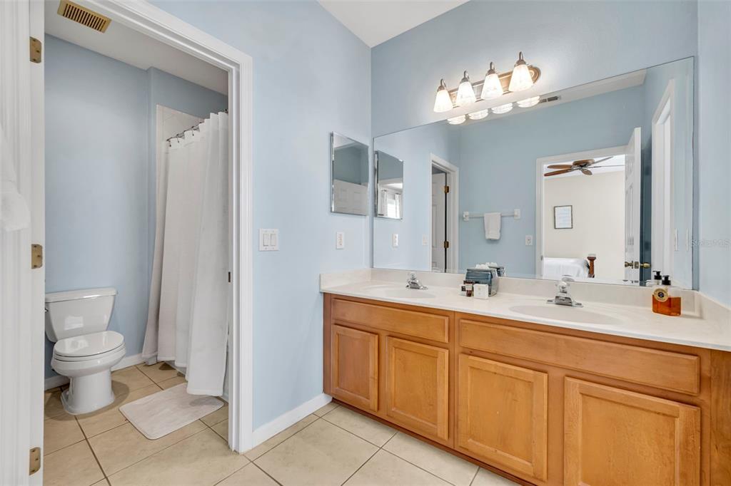 Upstairs, you’ll find two spacious primary suites, each with walk-in closets, ceiling fans, and bathrooms with double vanities and shower/tub combos. Laundry is upstairs for ease.